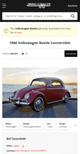 This 1966 Volkswagen Beetle convertible is said to have been acquired by the current owner in 2022 from the second owner in California who had owned the car since 1975. Finished in Ruby Red over white vinyl upholstery, the car is powered by a 1.3-liter flat-four paired with a four-speed manual transaxle. Equipment includes a tan soft top, 15″ steel wheels with hubcaps, chrome bumpers and trim, crank windows, and a Sapphire radio. Service during current ownership is said to have included replacing the brake master cylinder and suspension components. This Beetle convertible is now offered by the seller on behalf of the current owner with service records, a mileage log, 1975 purchase documents, a boot cover, black California license plates, manufacturer’s literature, and a clean California title.