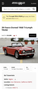 This 1968 Triumph TR250 was reportedly sold new in Southern California, where it spent time before being moved to Connecticut in 1980 and subsequently acquired by the current owner in 1983. Work in 1992 consisted of a repaint in red along with replacement black upholstery, carpets, and door panels. A 2.5-liter inline-six delivers power to the rear wheels through a four-speed manual transmission, and a replacement black soft top is fitted along with chrome knock-off wire wheels, power-assisted front disc brakes, twin Zenith-Stromberg carburetors, a wood dash panel, and a Moto-Lita steering wheel. Work since 2020 has reportedly included overhauling the carburetors and replacing the fuel pump, alternator, clutch, coolant hoses, brake wear components, dampers, heater control valve, and turn signal switch. This TR250 is offered by the seller on behalf of the current owner with spare parts, a tool kit, a black top boot and tonneau cover, a copy of the British Motor Industry Heritage Trust certificate, service records, and a clean California title in the owner’s name.