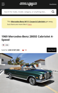 This 1969 Mercedes-Benz 280SE cabriolet is one of approximately 1,390 examples produced between 1968 and 1971. The car was refurbished in the 1990s and was acquired by the current owner in 2013. It is powered by a replacement 2.8-liter inline-six paired with a four-speed manual transmission and is finished in Moss Green Metallic over beige leather. Equipment includes a brown convertible top, 14″ steel wheels with covers, disc brakes, US-specification headlights, lap belts, a Becker AM/FM radio, and air conditioning. This W111 cabriolet is now offered by the seller on behalf of the current owner with a copy of the data card, manufacturer’s literature, service records, refurbishment photos, Concours judging sheets, spare parts, a car cover, and a clean California title in the owner’s name.